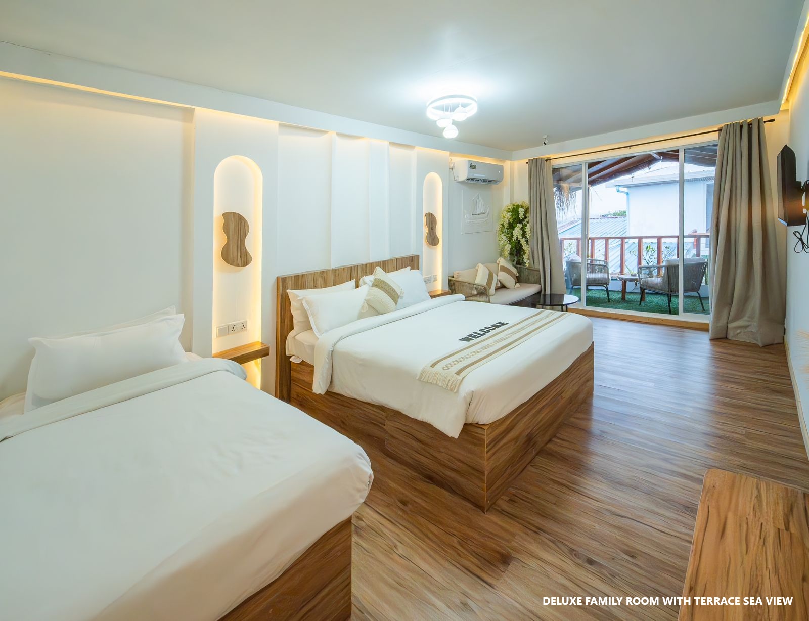 Sandy Heaven Hotel rooms are featured follows the traditions of Maldives architectural designs. The Hotel is built with teak panels and coral stone walls. All the Rooms designed and built by local craftsmen. The stunning new 7 luxury style bedroom designs for your inspiration. Hotel is located near by the beach, 02 minutes walk.Dine at our A la Carte Jaafai restaurant embark on a journey through inspired mix cuisine around the world. Hotel also offer exclusive and personalized ‘Dining by Design experiences from sunrise breakfast on the beach, to a private B.B.Q dinner served at the beach or sand bank. .